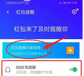11. 第十一步退回【红包提醒】页面,根据下图箭头所指,点击【红包提醒功能受限】选项。