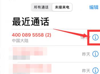 2. 进入电话页面后,点击底部的通话记录选项,在打开的通话记录页面,找到想要拉黑的电话,点击右侧的感叹号图标