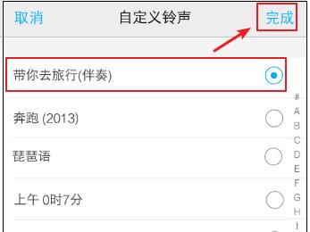 5. 第五步在跳转的页面中,先勾选相关铃声,接着根据下图箭头所指,点击右上角【完成】选项。