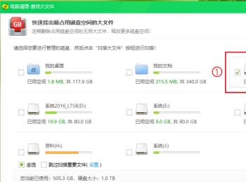 4. 如图,在打开的页面,勾选上需要进行管理的磁盘,以“C盘”为例,然后点击右上方的【扫描大文件】按钮。