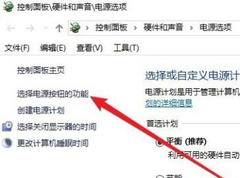 5. 第五步在弹出的窗口中,根据下图箭头所指,点击左侧【选择电源按钮的功能】。