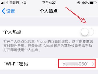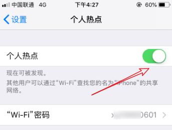 2. 第二步在跳转的页面中,根据下图箭头所指,将【个人热点】选项后的圆圈向右滑动,启用该功能。