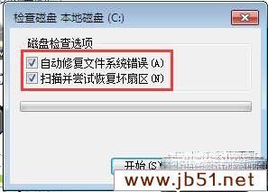 ③全选磁盘检查选项,然后点击开始,最后等待修复完成重启电脑即可,如图所示: