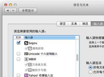 点击桌面左上角苹果图标打开菜单,点击系统偏好设置,在系统偏好设置窗口点击“语言与文本-输入源”,在左侧列表找到Sogou-搜狗拼音,打钩选中(可以在底部输入框输入sogou快速查找),同时选中“在菜单栏中显示输入法菜单”,可以设置“键盘快捷键”为cmd+space选择上一个输入源