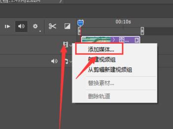 2. 在下方的视频轨道上,点击如图箭头所指图标,在打开的菜单中,选择添加媒体选项