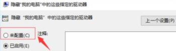 4. 双击该选项,在弹出的属性窗口中,点选上左上方的未配置选项,最后点击底部的确定按钮即可找回D盘了。