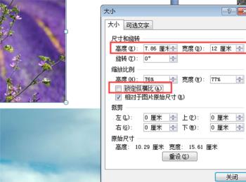 3. 在弹出的大小窗口中,根据自己的需要,对高度和宽度值进行设置,并将锁定纵横比前面的√取消。