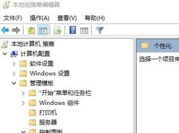 3. 如图,进入本地组策略编辑器窗口中,依次点击左侧的“计算机配置/管理模板/控制面板/个性化”选项。