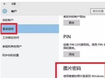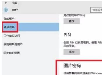 3.第三步,在下图所示的账户设置页面中,点击页面左侧的登陆选项,接着点击图片密码下面的添加选项。