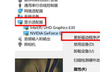 3.第三步,在下图所示的设备管理器页面中,右击显示适配器选项,接着点击弹出窗口中的更新驱动程序选项。