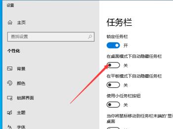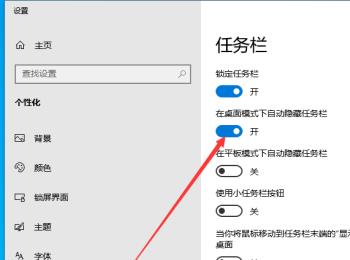 2. 第二步打开【任务栏】窗口后,根据下图箭头所指,将【在桌面模式下自动隐藏任务栏】选项下的滑块向右滑动。