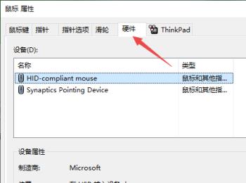 5. 在弹出的鼠标属性窗口中,上方切换到硬件选项下,然后点击右下方的属性按钮;