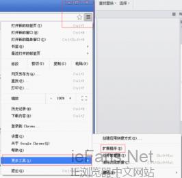 接着点击浏览器右边的有三横的图标,选择更多工具–扩展程序,如图: