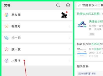 2. 然后进入微信的小程序页面,可以选择在微信主页面下拉,或者依次单击发现—小程序,在搜索框中,输入【快捷去水印工具箱】,然后在结果中,点击。