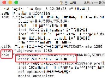 输入命令后,终端上显示出了很多信息,我们找到 en0下的 ether后面的一串字符,就是mac地址了。