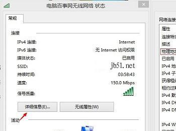 推荐使用命令行查看,不过你需要知道你用的是哪哥网卡上的网,笔记本一般都是两个网卡,一个无线网卡,一个有线网卡。大家可以通过网上邻居查看用的的是哪个网卡上网,就定位到那个网卡查看信息就可以了。