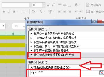 2.打开窗口,点击选择【使用公式确定要设置格式的单元格】,然后在下方输入:=¥A1<>"",点击右侧的【格式】