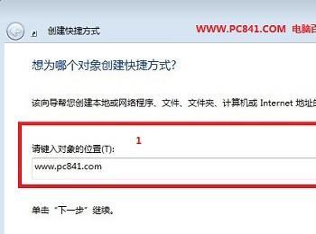 在“请键入的对象位置”下面输入电脑百事网网址www.pc841.com然后再点击“下一步”,如下图: