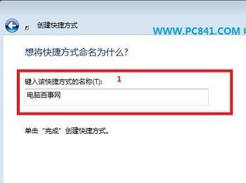 三、下一步之后,如下图,在“键入快捷方式名称”下面我们输入“电脑百事网”然后点击底部的完成即可,如下图所示:
