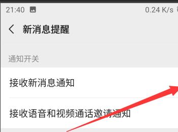 3. 第三步进入【新消息提醒】页面后,根据下图箭头所指,将【接收新消息通知】选项后的圆圈向右滑动,启用该功能。