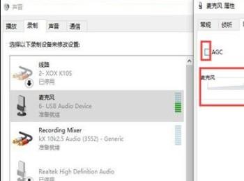 2. 点击USB麦克风之后,在弹出的属性窗口中,取消勾选的AGC音频加强功能,并将音量级别调到100,点击确定。