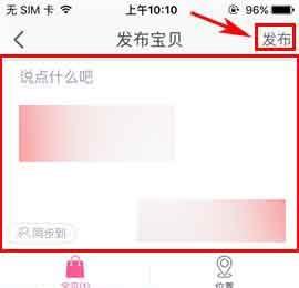 3)点击选择要发布的宝贝,接着点击右下方的【发布】,接着点击编辑框输入宝贝内容,最后点击右上角的【发布】即可。(如下图)