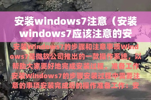 Windows7是微软公司推出的一款操作系统,安装Windows7是很多用户的需求,但是在安装过程中也需要注意一些事项。本文将为大家介绍安装Windows7的步骤和注意事项,以帮助大家更好地完成安装过程。