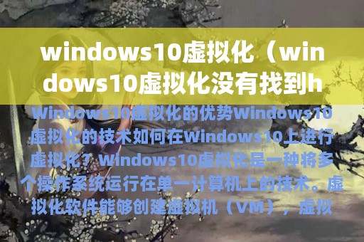 Windows 10虚拟化是一种将多个操作系统运行在单一计算机上的技术,被广泛应用于软件开发、网络安全、教育等领域。本文将介绍Windows 10虚拟化的相关概念、技术和应用。