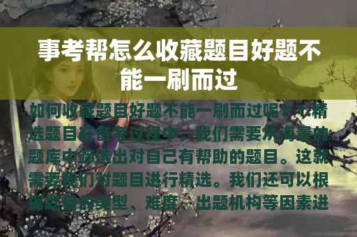事考帮是一款备考公务员考试的APP,其中收藏题目是备考过程中必不可少的一环。但是,仅仅收藏题目还不够,好题不能一刷而过才是最重要的。那么,如何收藏题目好题不能一刷而过呢?