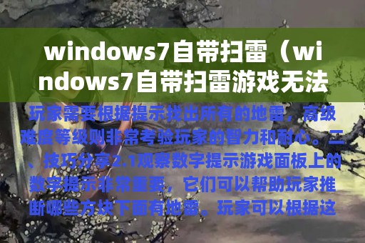 Windows 7自带的扫雷是一款经典的休闲游戏,它可以让我们在忙碌的工作生活中放松心情,消磨时间。本文将围绕Windows 7自带扫雷这一主题,为大家介绍它的玩法、技巧和注意事项,希望能够帮助大家更好地享受游戏的乐趣。
