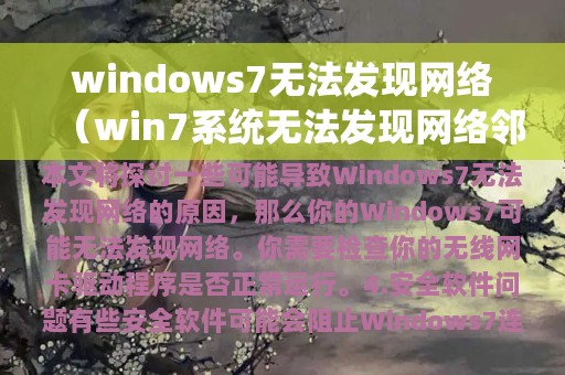 Windows7无法发现网络的原因可能有很多,但通常可以通过检查无线网卡驱动程序、网络适配器、网络设置、安全软件和网络硬件来解决问题。如果你仍然无法解决问题,你可能需要寻求专业帮助。