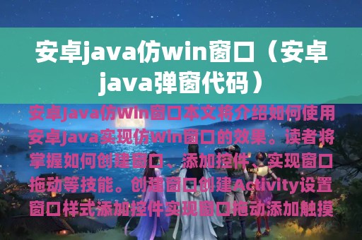 本文将介绍如何使用安卓Java实现仿Win窗口的效果。通过本文的学习,读者将掌握如何创建窗口、添加控件、实现窗口拖动等技能。