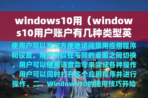 Windows 10是一款功能强大、易于使用的操作系统,通过掌握其主要特性和使用技巧,可以更加高效地完成各种操作。