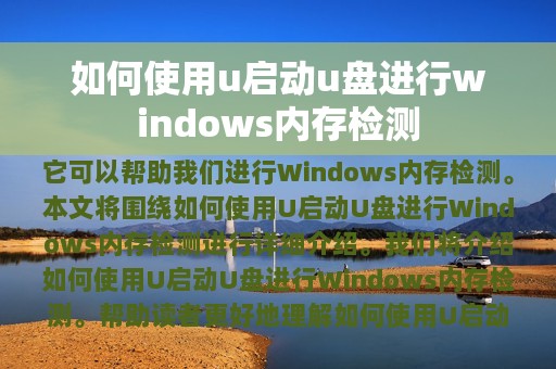 U启动U盘是一款非常实用的工具,它可以帮助我们进行Windows内存检测。本文将围绕如何使用U启动U盘进行Windows内存检测进行详细介绍。首先,我们将介绍U启动U盘的基本使用方法,然后,我们将介绍如何使用U启动U盘进行Windows内存检测。最后,我们将总结本文的内容,帮助读者更好地理解如何使用U启动U盘进行Windows内存检测。