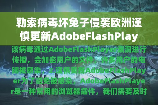 勒索病毒坏兔子是一种新型的勒索病毒,近期在欧洲肆虐。为了避免被感染,我们需要谨慎更新AdobeFlashPlayer。更新AdobeFlashPlayer非常简单,只需要打开浏览器,访问Adobe官网,下载最新的FlashPlayer安装包,然后按照提示进行安装即可。同时,我们还需要注意一些安全问题,比如不要随意下载和安装来路不明的软件,不要打开来路不明的邮件附件等。