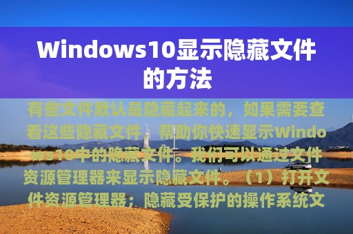 Windows10操作系统中,有些文件默认是隐藏起来的,如果需要查看这些隐藏文件,该怎么办呢?本文将介绍几种简单易行的方法,帮助你快速显示Windows10中的隐藏文件。
