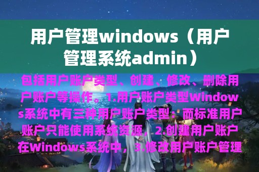 Windows系统是广泛使用的操作系统之一,用户管理是系统管理的重要组成部分。本文将介绍Windows系统中的用户管理,包括用户账户类型、创建、修改、删除用户账户等操作。