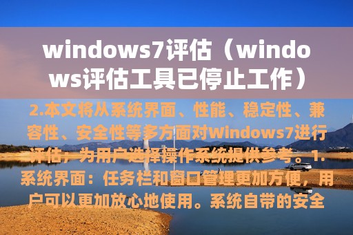 2. 本文将从系统界面、性能、稳定性、兼容性、安全性等多方面对Windows7进行评估;