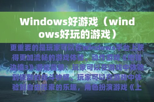 随着计算机性能的不断提升,越来越多的游戏开始登陆Windows平台。这些游戏除了画面精美、音效震撼,更重要的是玩家可以在Windows平台上获得更加流畅的游戏体验。本文将为大家介绍一些Windows平台上的好游戏,包括以下内容: