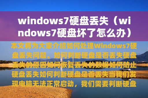 Windows 7硬盘丢失问题是很常见的,无论是因为误操作还是其他原因,都可能导致硬盘数据的丢失。如果不及时处理,可能会给我们带来很大的麻烦。本文将为大家介绍如何处理Windows 7硬盘丢失问题。