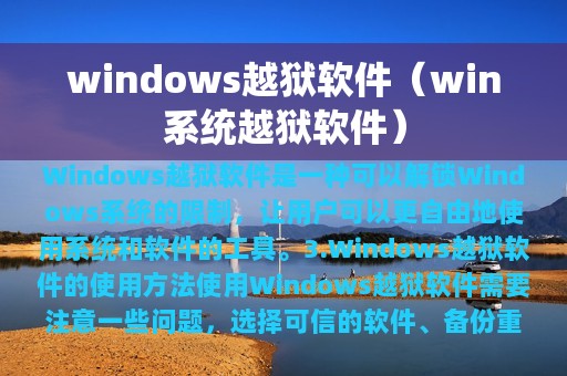 Windows越狱软件是一种解锁Windows系统限制的工具,可以帮助用户更自由地使用系统和软件。用户可以根据自己的需要选择合适的越狱软件,并注意使用方法和风险。使用越狱软件需要谨慎操作,避免造成不必要的损失。