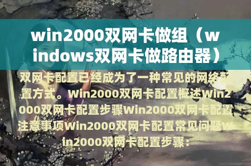 随着网络的不断发展,双网卡配置已经成为了一种常见的网络配置方式。Win2000系统作为经典的操作系统之一,其双网卡配置也备受关注。本文将围绕Win2000双网卡做组进行详细介绍。