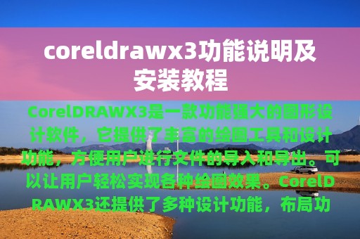 CorelDRAW X3是一款功能强大的图形设计软件,它提供了丰富的绘图工具和设计功能,可以满足各种设计需求。本文为大家介绍了CorelDRAW X3的功能以及安装教程,希望对大家有所帮助。