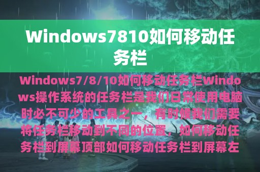 Windows操作系统的任务栏是我们日常使用电脑时必不可少的工具之一,它可以方便我们快速启动应用程序,查看通知等。但是,有时候我们需要将任务栏移动到不同的位置,以便更好地利用屏幕空间。本文将介绍Windows 7/8/10如何移动任务栏,并提供详细的步骤和注意事项。