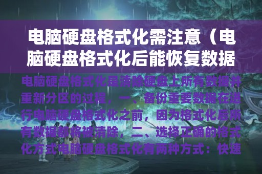 电脑硬盘格式化是清除硬盘上所有数据并重新分区的过程,但是在进行格式化时需要注意备份重要数据、选择正确的格式化方式和文件系统,以及避免在格式化过程中断电。这些细节都可以让我们更好地保护硬盘和数据安全。