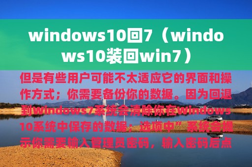 3. 回退的具体操作步骤为:进入“设置”界面,选择“更新和安全”,在“恢复”选项中选择“返回Windows 7”,输入管理员密码后等待系统回退完成;