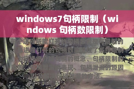 Windows7句柄限制是指在Windows7系统中,每个进程所能打开的句柄数量是有限制的。当进程打开的句柄数量超过了系统限制,就会出现句柄泄漏的问题,导致系统性能下降,甚至崩溃。本文将围绕Windows7句柄限制,为您详细介绍句柄的概念、句柄限制的原因、句柄泄漏的表现、句柄泄漏的原因以及解决句柄泄漏的方法。