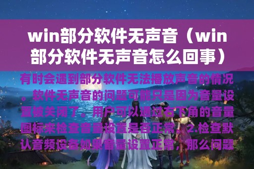 在使用Windows系统时,遇到部分软件无声音的问题可能会影响到正常的使用体验。为了解决这种问题,用户可以通过检查音量设置、默认音频设备、音频驱动程序和软件设置等多种方法来解决。如果以上方法都无法解决问题,那么可能需要寻求更专业的技术支持。