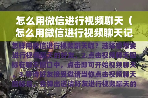 微信是一款非常流行的社交软件,除了文字聊天和语音通话外,它还支持视频聊天。在疫情期间,视频聊天成为了人们沟通的重要方式之一。那么,怎样用微信进行视频聊天呢?下面我们就来详细介绍一下。
