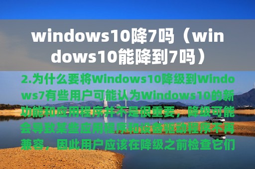 2. 用户可能想将Windows 10降级到Windows 7,但需要注意备份数据和检查应用程序和驱动程序的兼容性。